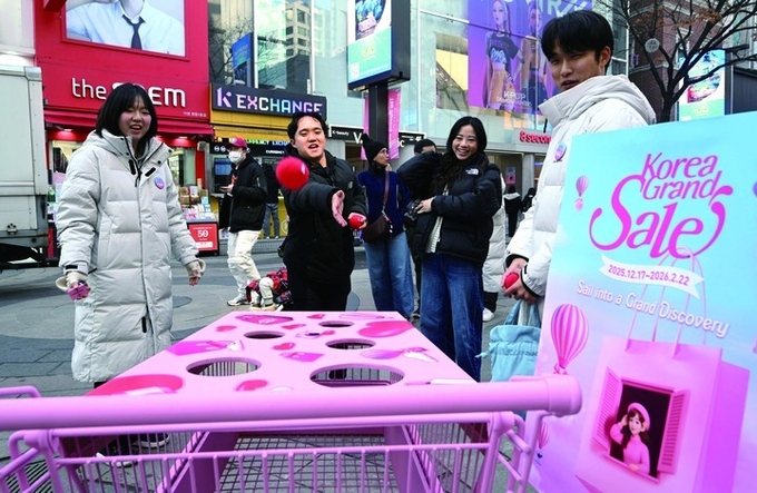 2025년 12월 서울 중구 명동거리 일대에서 관광객들이 코리아그랜드세일 홍보 부스를 체험하고 있다. 사진 뉴시스