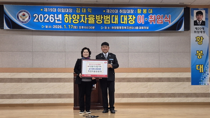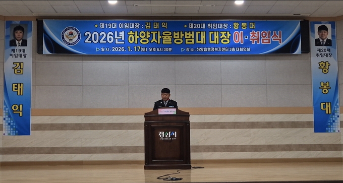 [경산/김근해기자] 경산시 하양자율방범대(신임 대장 황봉대)는 지난 17일 하양읍 행정복지센터 3층 대강당에서 2026년 대장단 이·취임식을 개최했다.