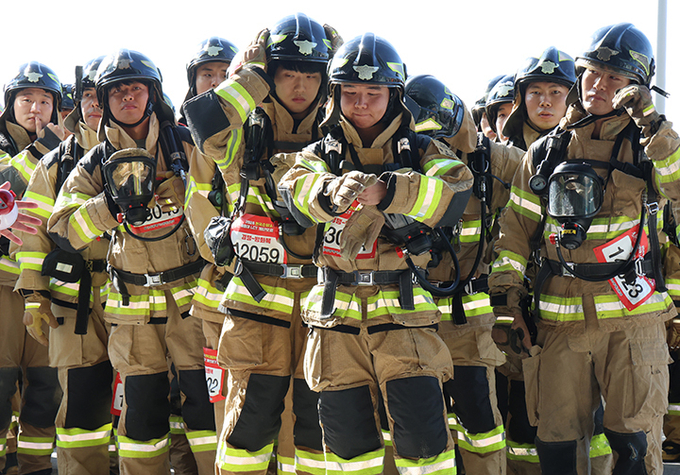 30일 부산 해운대구 엘시티에서 열린 전국소방공무원 엘시티(LCT) 계단 오르기 대회에서 20㎏ 달하는 화재진압 장비를 착용한 소방대원들이 출발을 기다리고 있다. 2024.10.30 (사진=연합뉴스)