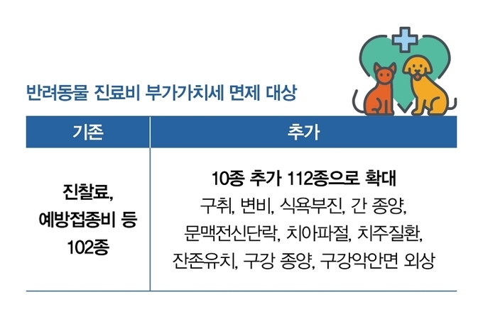 1월 1일부터 반려동물 진료비에 대한 부가가치세 면제 대상이 확대됐다. 정부는 반려동물 양육 가구 증가에 따라 진료비 부담을 완화하기 위해 면세 범위를 지속적으로 넓혀왔다. 2023년부터 진찰·투약·검사·치료 등 치료목적 진료까지 면세를 적용했으며 올해부터 질병·증상 항목 10종을 추가해 면세 대상이 112종으로 확대됐다. 이에 따라 대부분의 필수 진료가 부가가치세 없이 이뤄진다.
