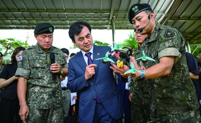 안규백 국방부 장관이 2025년 9월 4일 육군 제36사단에서 교육용 소형드론에 대한 설명을 듣고 있다. 사진 국방부