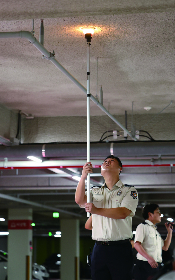 한 아파트 지하주차장에서 소방관이 화재감지기를 점검하고 있다. 사진 뉴시스