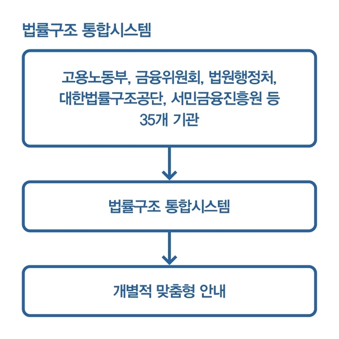 정부와 공공기관, 민간단체 등 35개 기관의 법률구조 서비스가 하나의 플랫폼을 통해 통합 제공된다. 이용자는 법률구조 통합시스템을 통해 법률 정보, 상담, 접수, 진행 과정과 결과 확인까지 한번에 이용할 수 있다. 인공지능을 활용해 개인에게 적합한 법률구조 서비스를 맞춤형으로 제공한다.