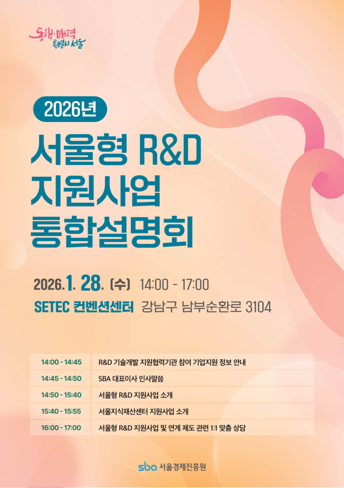 한편, 시는 오는 28일(수) 세텍(SETEC)에서 서울 소재 중소․벤처․창업기업 중심 산학연 컨소시엄을 대상으로 한 ‘서울형 R&D 지원사업 통합설명회’를 개최한다. 세부 사업별 자세한 사항은 ‘서울경제진흥원 R&D지원센터(seoul.rnbd.kr)’ 누리집에서 확인할 수 있다.