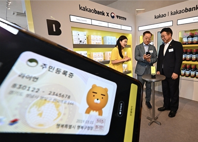 윤호중 행정안전부 장관이 23일 서울 성동구 앤더슨씨에서 열린 2025년 모바일 신분증 민간개방 오픈 행사에서 카카오뱅크 모바일신분증 서비스를 체험하고 있다. 2025.7.23 (ⓒ뉴스1)