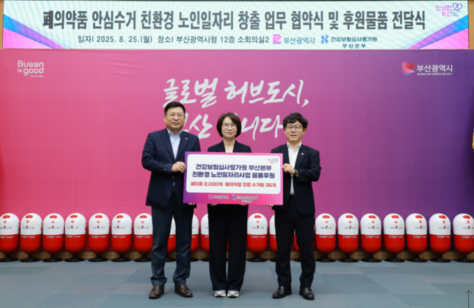 [후원물품 전달식] 건강보험심사평가원 부산본부는 사업의 원활한 추진을 응원하며 5백만 원 상당의 폐의약품 수거함 60세트를 노인일자리 수행기관에 전달한다. 수거함은 2월 중 지역 경로당·시니어클럽·행정복지센터 등에 설치돼 시민들은 가정에서 발생한 폐의약품을 손쉽게 배출할 수 있다.