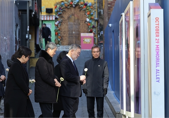 10.29이태원참사 특별조사위원회 송기춘 위원장과 특조위원들이 서울 용산구 이태원역 1번 출구 골목 '10.29 기억과 안전의 길'을 찾아 헌화하고 있다. 2026.1.5 (ⓒ뉴스1)