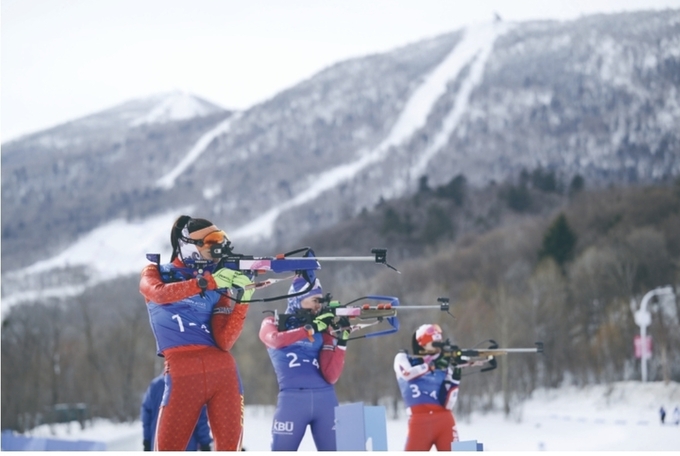 정주미(맨 오른쪽)가 2025년 2월 13일 중국 하얼빈 야부리스키리조트에서 열린 2025 하얼빈 동계아시안게임 여자 바이애슬론 계주 경기에서 사격하고 있다. 사진 뉴시스