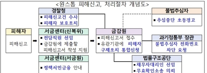 아울러 피해 발생 시 피해자 보호를 위해 피해자가 '한 번의 신고'만으로 추심 중단 및 피해 구제를 위한 모든 정부서비스를 신청할 수 있도록 '원스톱 종합·전담 지원체계'를 구축한다.