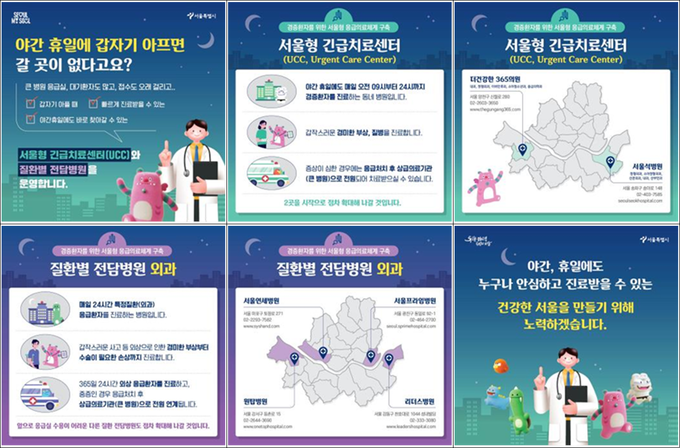 서울형 긴급치료센터는 매일 09시부터 24시까지 외상, 고열 등 급성질환을 진료하고, 질환별 전담병원은 매일 24시간 외과계 응급환자를 진료한다.
