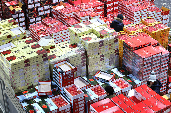 설 연휴를 10일 앞둔 4일 오전 인천 남동구 남촌농산물도매시장에 과일상자가 가득 쌓여 있다. 2026.2.4 (사진=연합뉴스)