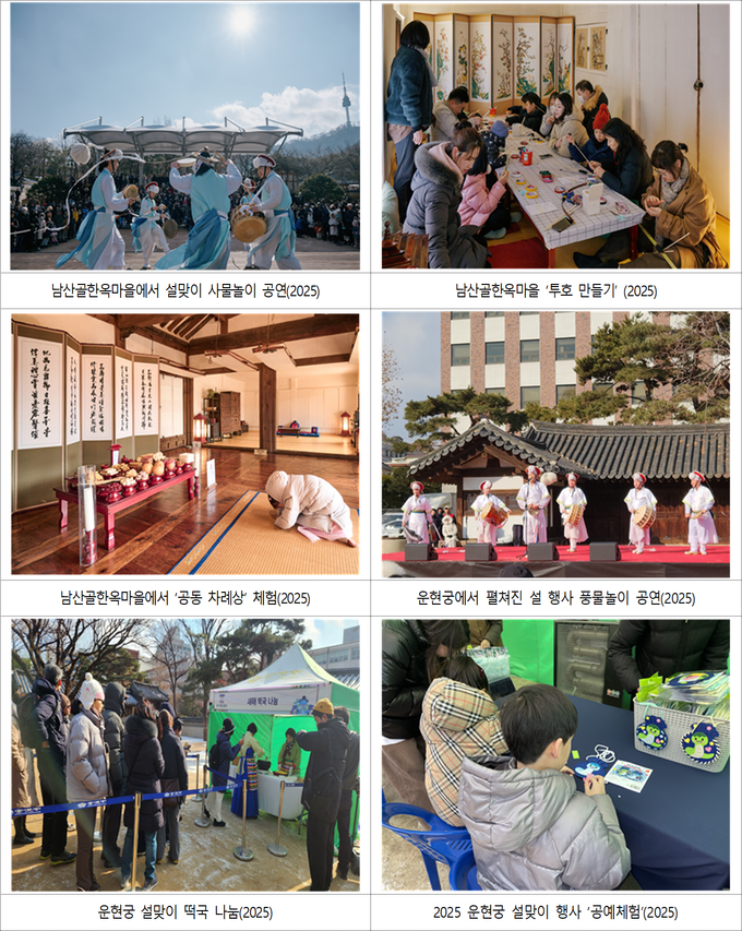 먼저 2.16.(월)~2.18.(수) 서울의 대표적 전통문화 공간인 ▴남산골한옥마을 ▴운현궁에서 세시풍속을 체험하는 설맞이 행사가 열린다. 떡국 나눔을 비롯한 다양한 전통 체험 프로그램과 공연이 마련돼 흥겨운 명절 분위기를 더할 예정이다.