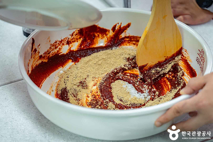 ⓷ 고추장 반죽 만들기: 식힌 찹쌀풀에 메줏가루, 고춧가루, 소금을 넣고 잘 섞는다. 모든 재료가 골고루 섞일 때까지 충분히 저어준다. 이때 청주를 넣으면 발효를 돕고, 고추장의 맛을 더 깊게 만들어 준다.