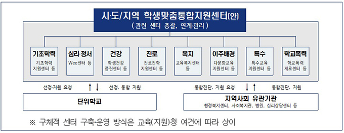 특히 교육(지원)청 내 설치하는 학생맞춤통합지원센터는 기초학력, 심리·정서, 진로 등 학생 지원과 관련된 여러 센터·사업을 총괄·조정하게 된다.