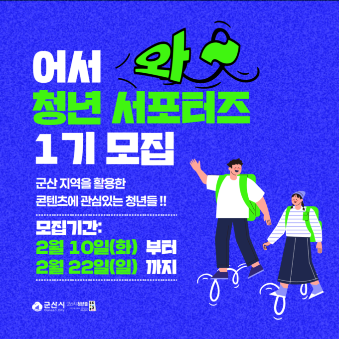 [군산/김주창기자] 군산시 청년뜰(청년센터·창업센터)이 군산의 숨은 가치를 청년의 시각으로 재발견하고, 이를 콘텐츠로 널리 알릴 ‘군산 청년 서포터즈 1기’를 공개 모집한다.