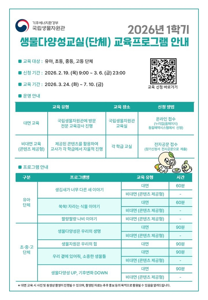 [한국방송/최동민기자] 기후에너지환경부 소속 국립생물자원관(관장 유호)은 2월 19일부터 유아(3~5세), 어린이(6~12세) 및 청소년(13~18세) 단체를 대상으로 2026년 1학기 생물다양성교육 참가자를 모집한다고 밝혔다.