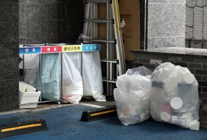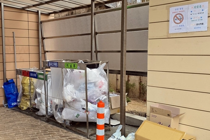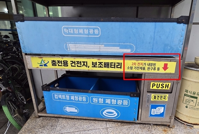 폐가전 수거함에는 '이차전지가 내장된 소형 가전제품과 완구류 등'을 버리라는 노란색 안내판이 보였다.