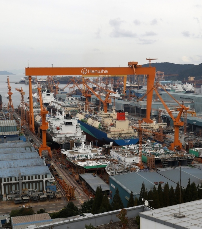경남 거제시 한화오션 거제사업장에 대형 크레인과 건조 중인 선박이 보이고 있다. 2025.10.30 (ⓒ뉴스1)