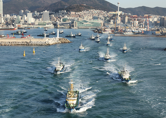 지난 23일 오전 대형선망 어선들이 부산 서구 공동어시장에서 출항해 먼바다로 나가고 있다.(사진=연합뉴스)