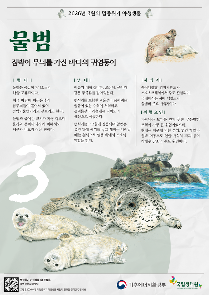 기후에너지환경부(장관 김성환)는 봄이면 우리나라 백령도를 찾아오는 ‘물범’을 3월 ‘이달의 멸종위기 야생생물’로 선정했다고 밝혔다.