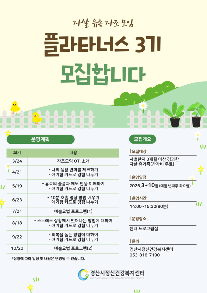 [경산/김근해기자] 경산시(시장 조현일)는 오는 3월 24일부터 경산시정신건강복지센터에서 자살 유족들을 위한 플라타너스 자조모임 3기를 운영한다고 발표했다.