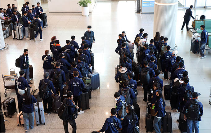 27일 오전 인천공항에서 E9비자로 입국한 캄보디아 노동자들이 이동을 하기위해 줄지어 기다리고 있다. 2025.5.27 (ⓒ뉴스1)