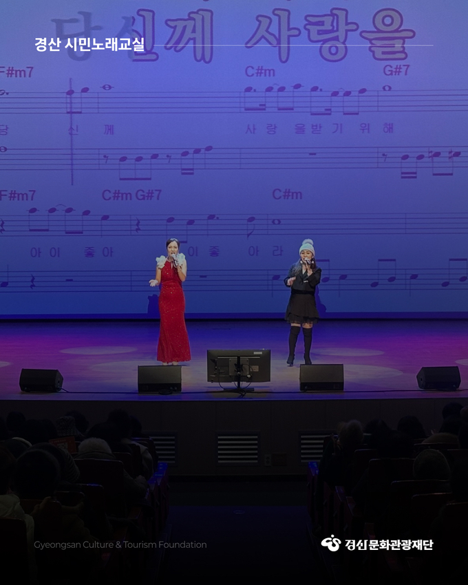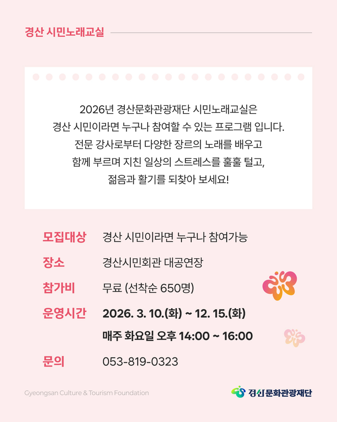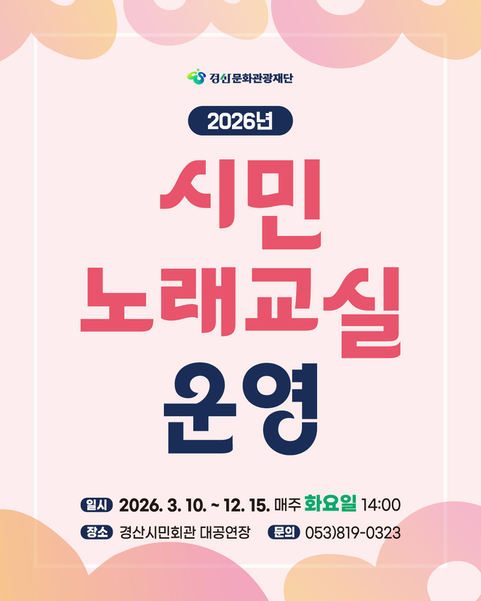 이번 ‘시민노래교실’은 10일 개강식을 시작으로 12월 15일까지 매주 화요일 오후 2시에 경산시민회관 대공연장에서 무료로 운영된다. 전문가의 체계적인 지도 아래 대중가요를 함께 배우고 노래하며 활력이 넘치는 시간을 만들어가는 것은 물론, 특별 초청 인기가수와 함께하는 특강도 계획 중이다. 강의는 접수나 등록 없이 언제든지 자유롭게 수강하면 된다.