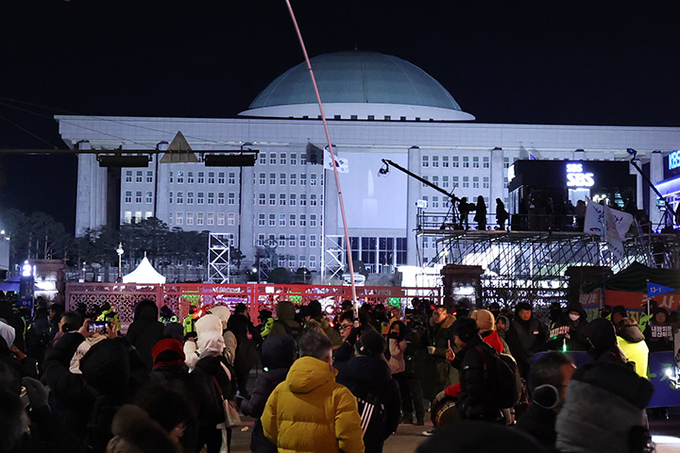 12·3 비상계엄 1년을 맞은 3일 서울 여의도 국회 앞에서 '12·3 내란외환 청산과 종식, 사회대개혁 시민대행진'이 열린 가운데 국회 본청에 촛불 그림의 미디어 파사드가 나오고 있다. 2025.12.3 (ⓒ뉴스1)