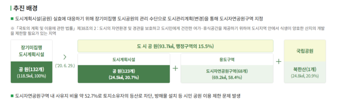 도시자연공원구역의 지정목적을 달성하기 위해 필요한 경우 시민이 이용하는 등산로·산책로 등 공원 간 연결 토지에 대해 매년 공모를 통해 협의매수를 추진하고 있다.