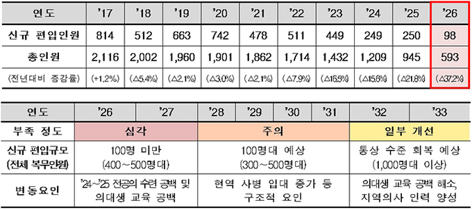 그러나 올해 복무만료 인원 450명 대비 공보의 충원율은 22%에 불과함에 따라 의과 공보의 전체 규모는 2025년 945명에서 2026년 593명으로 대폭 감소했다.