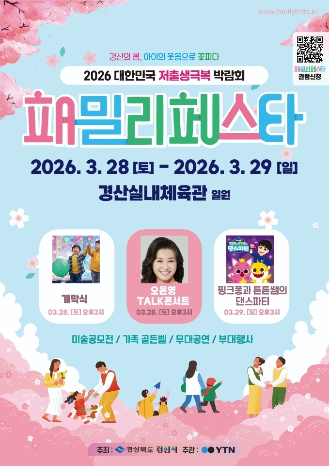 경산시(시장 조현일)는 가족친화적 사회 분위기를 조성하고 결혼·출산·양육에 대한 긍정적 인식을 확산하기 위해 28일과 29일 이틀간 경산 실내 체육관 일원에서 「2026 패밀리 페스타」를 개최한다.