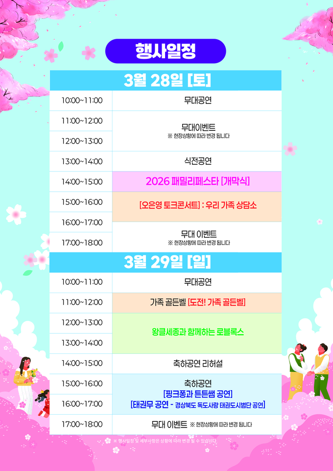 한편, 「2026 패밀리 페스타」 행사정보는 경산시 홈페이지 및 공식 SNS에서 확인할 수 있으며, 오은영 토크콘서트 사연 및 관람 신청과 어린이 미술 공모전, 왕클세종과 함께하는 로블록스 게임매치 신청은 패밀리 페스타 홈페이지를 통하여 사전 접수할 수 있다.