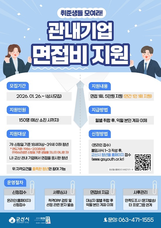 지원 대상은 군산시 소재 사업장에 면접을 응시한 18세~39세 구직 청년 150명으로 지원 금액은 1회 5만 원이며 많은 청년에게 기회를 제공하기 위해 연간 1회만 지원한다.