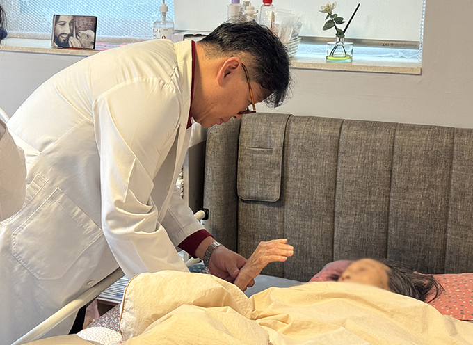 침대에 누운 어르신 곁으로 의료진이 다가갔다. 유창훈 센터장은 맥을 짚으며 상태를 확인했고, 간호사는 굳어진 근육을 하나하나 풀어주며 경직 상태를 살폈다.
