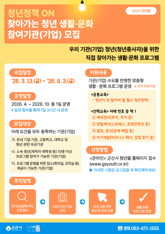 현재 모집은 4월 3일까지 진행되며, 참여를 희망하는 기관(기업)은 군산시 청년뜰 누리집을 통해 온라인으로 신청할 수 있다. 자세한 사항은 누리집 공고문을 참고하거나 청년지원팀(☎ 063-471-1555)으로 문의하면 된다.
