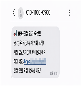 1. [유가·방산 화제주 빙자 투자리딩방 유인] 최근, 이른바 ‘전쟁 수혜주’ 투자를 통한 고수익을 보장한다는 미끼 문자가 대량 살포되고 있다.