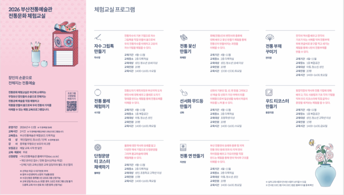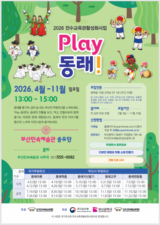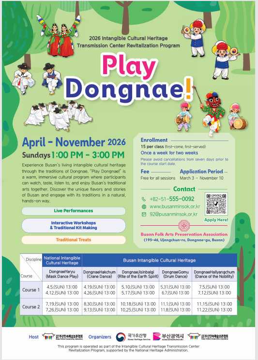 주요 프로그램은 ▲동래야류·동래학춤 등 공연과 체험이 결합한 ‘Play 동래!’ ▲자수·도자·단청 등 장인의 기술을 배우는 전통문화체험교실 ▲초등학생 대상 ‘부산농악 놀이터’ ▲다문화·어린이 참여형 ‘후리소리 전통교실’ 등으로 운영된다.