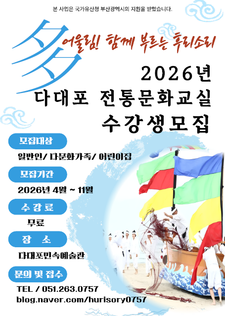 관련 문의는 부산민속예술관(☎051-555-0092), 부산전통예술관(☎051-758-2530), 구덕민속예술관(☎051-242-3100), 다대포민속예술관(☎051-263-0757)으로 하면 된다.