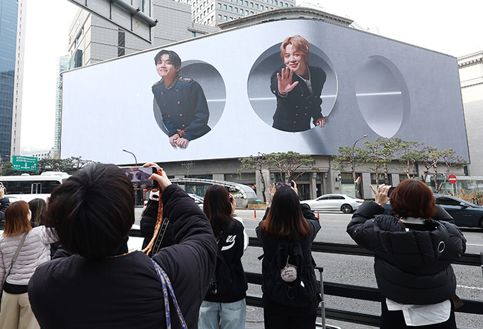 방탄소년단(BTS) 컴백 공연 다음 날인 22일 오전 서울 중구 신세계백화점 인근에서 방탄소년단의 팬클럽 ARMY가 송출되는 BTS의 모습을 사진 찍고 있다.(ⓒ뉴스1)