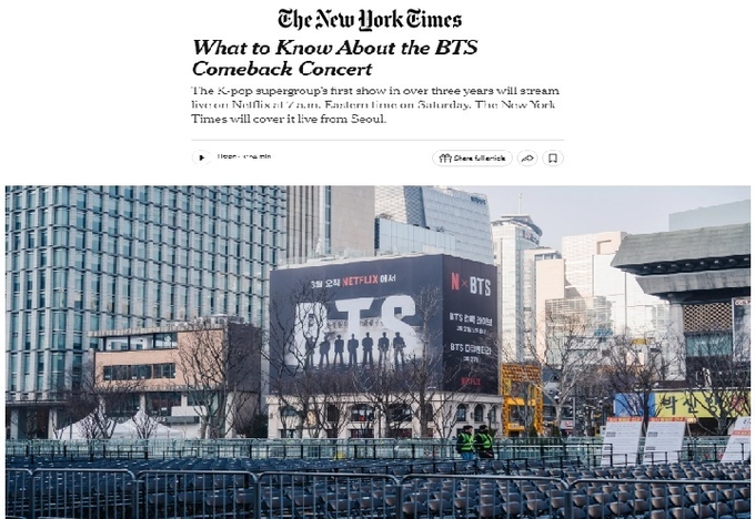 미국 뉴욕타임스는 지난 21일 이라는 제하 기사에서 "BTS의 이번 공연과 투어는 그룹뿐 아니라 한국 경제와 소프트파워 전반에도 큰 의미가 있다"고 보도했다.(이미지=뉴욕타임스 기사 캡처)