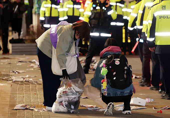 21일 오후 서울 종로구 광화문광장에서 열린 'BTS 컴백 라이브: 아리랑'이 끝난 후 한 아미 자원봉사단원이 쓰레기를 치우고 있다.(ⓒ뉴스1)