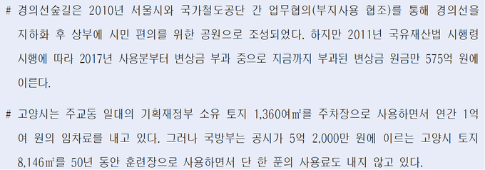 현재 공유재산법에 따르면 국가가 지자체 소유 공유재산을 공익목적으로 사용할 경우 무상사용이 가능한 반면, 국유재산법에 따르면 지자체가 국유재산을 동일한 목적으로 사용할 경우에는 사용료가 부과된다.