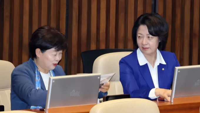 더불어민주당 소속 서영교 신임 국회 법제사법위원회 위원장(왼쪽)과 추미애 전 법사위원장이 31일 국회 본회의에서 대화하고 있다.
