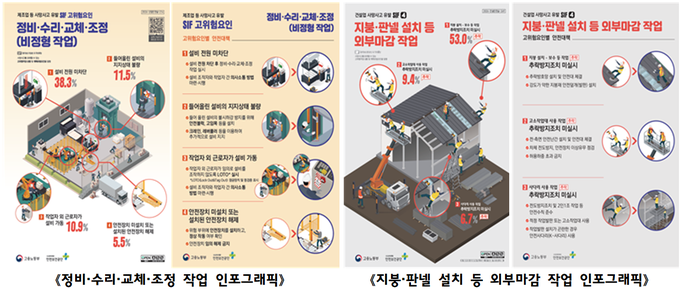 또한, 고위험작업별 재해유발요인과 예방대책을 쉽게 이해할 수 있는 인포그래픽* 자료(제조·기타 35종, 건설 10종)도 함께 제공한다. 사업장에서는 이 자료를 활용하여 TBM(작업시작 전 점검회의) 시 위험 및 안전조치를 확인하거나 안전보건교육 자료로도 활용할 수 있다.