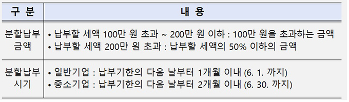 구체적으로 납부할 세액이 200만 원 이하면 100만 원을 초과하는 금액, 200만 원을 초과하면 납부할 세액의 50% 이하 금액을 납부 기한이 지난 후 1개월, 중소기업은 2개월 이내에 나누어 내면 된다.