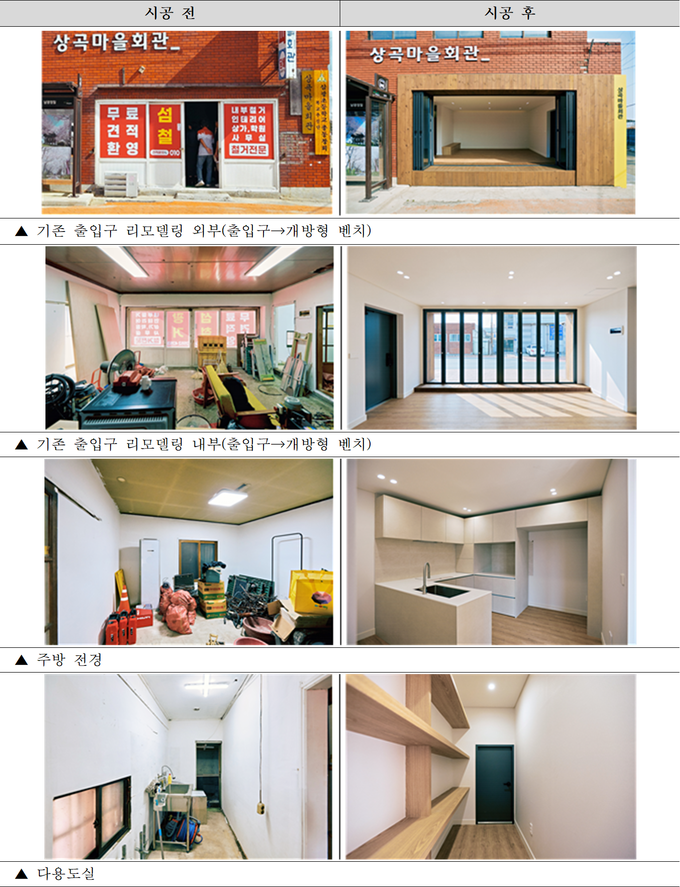 리모델링 대상지인 상곡마을회관은 과거 마을 구판장과 주민 자녀 공부방으로 활용되며 지역 주민들이 모이고 교류하는 공간으로 활용됐으나, 시설 노후화로 인해 최근에는 농기구 보관 창고로 사용되는 등 활용도가 저하된 상태였다.