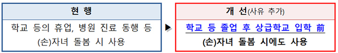 현재는 학교 휴업, 병원 진료 등 자녀·손자녀를 돌볼 경우 사용이 가능하나, 어린이집·유치원·학교를 졸업한 후 상급학교 입학 전 발생하는 학적 공백기에는 휴가 사용이 제한돼 실질적 돌봄 수요를 반영하지 못하는 한계가 있다.