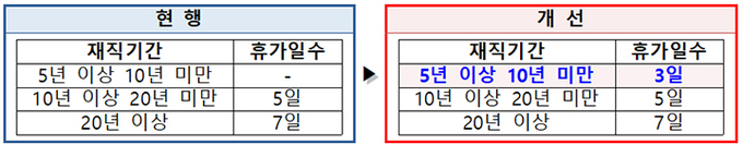 현재 재직기간 10년 이상 20년 미만인 공무원에게 5일, 20년 이상 공무원에게 7일 부여하는 장기재직휴가 범위를 5년 이상 10년 미만인 중간 연차 공무원까지 확대한다.