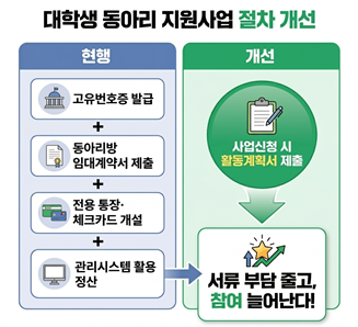 먼저 대학생 동아리가 서울시 시정 가치와 연계한 사회기여 활동에 참여할 때에 통장 개설, 고유번호증 발급, 동아리방 임대차계약서(무상사용승낙서) 등 서류 6종이 필요했던 신청 및 교부 절차를 올해부터는 3종으로 대폭 간소화해 대학생 동아리 참여를 높인다.