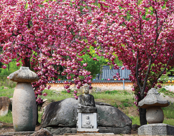 팔공산의 끝자락에 있는 환성사는 신라 시대에 창건된 고찰로, 고즈넉한 사찰의 분위기와 수려한 자연경관을 자랑한다. 특히 매년 4월 중후반이 되면 사찰 진입로부터 경내까지 탐스러운 겹벚꽃이 만개해 마치 동화 속 비밀 정원에 들어온 듯한 풍경을 연출한다.